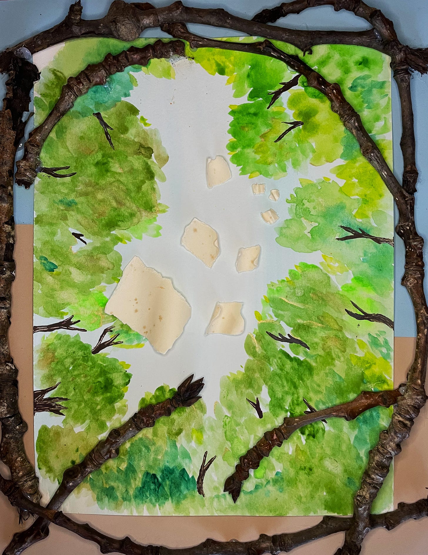 The accompanying art piece for this story is a 3-dimensional collage made from watercolor, folded paper, and tree branches.